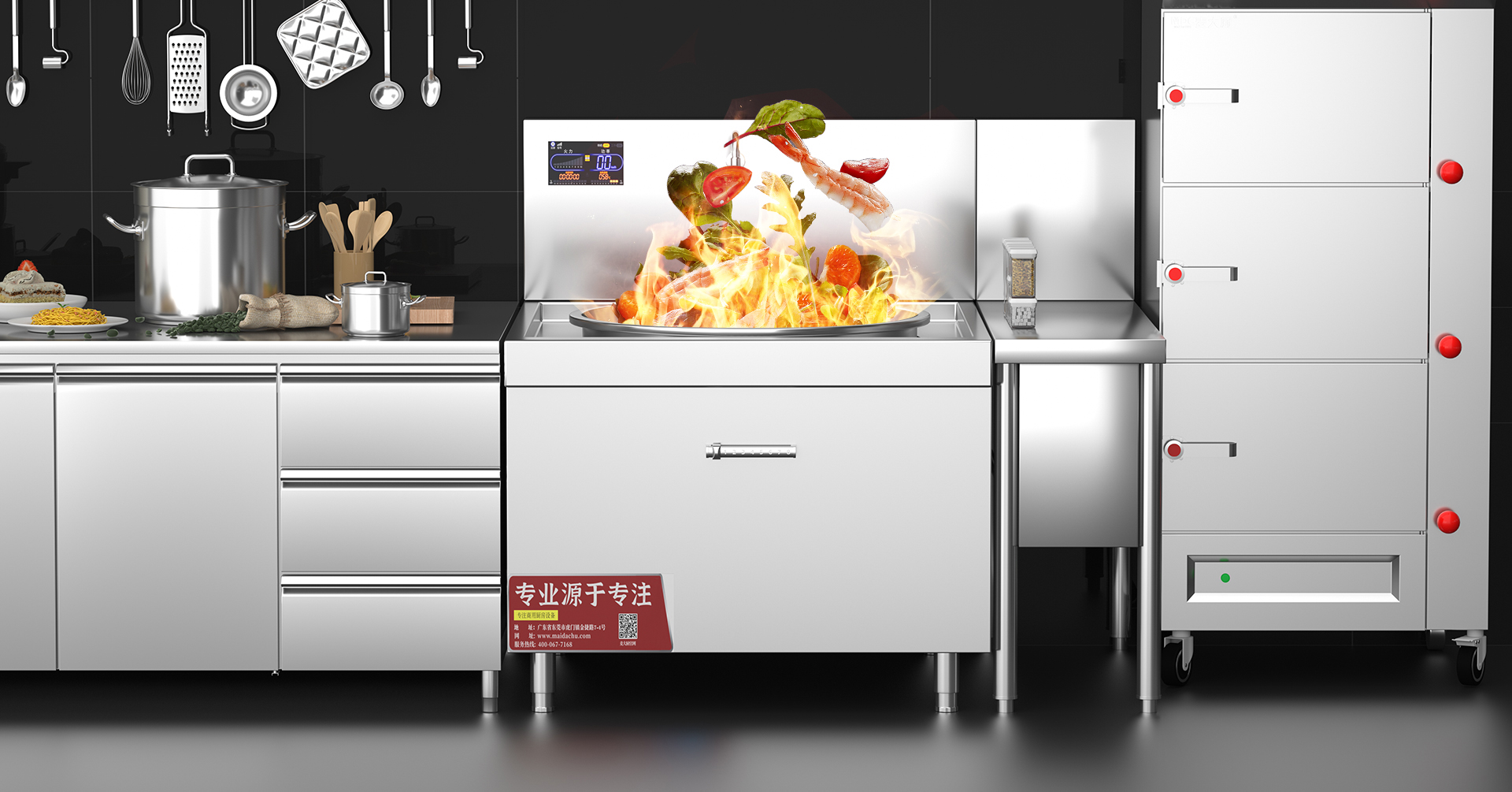 麥大廚廚房設(shè)備廠家研發(fā)、設(shè)計、生產(chǎn)、安裝和服務一站式解決。